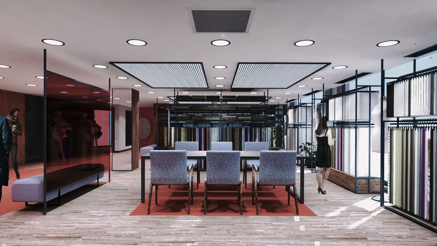 The project focuses on designing a showroom and entrance area for a textile company located in the organized industrial zone in Dudullu, Istanbul. The primary objective was to create an interior ambiance that contrasts sharply with the external environment, achieved through the use of soft yet striking colors and materials. Colored glass, wood panels and red marble are used to define this atmosphere, while steel grid structures and mesh panels create an industrial language in harmony with the surroundings.