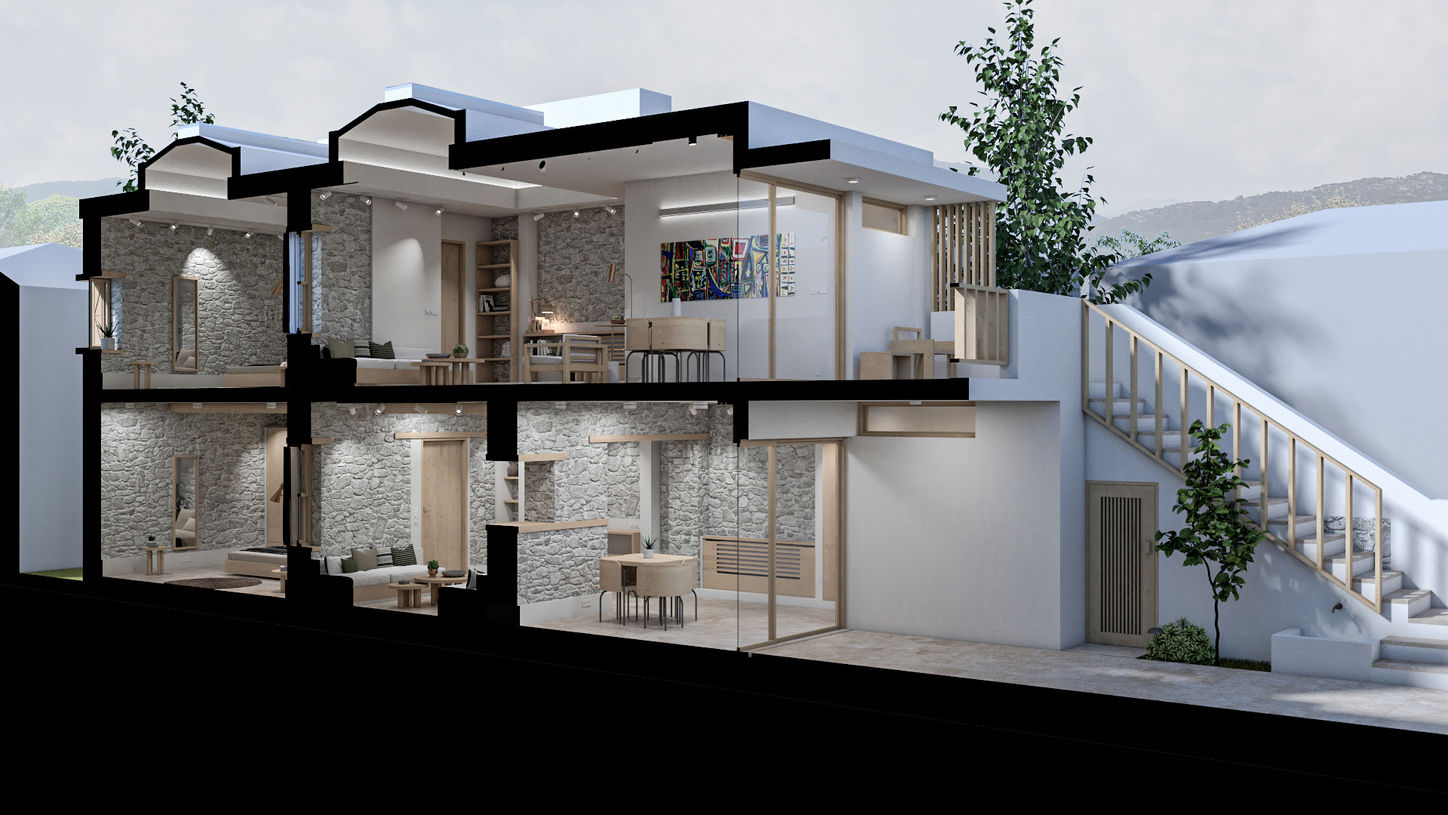 Guest House 01 is designed as a part of an art project focused on transforming the village's old stone buildings into workshops and accommodation places. The structure features preserved large-scale stone walls, fortified with reinforced concrete columns and beams to serve as a load-bearing system. Existing window openings and old stone ovens which are originally used for heating and kitchen purposes, were renovated and became an important component for interior design.
